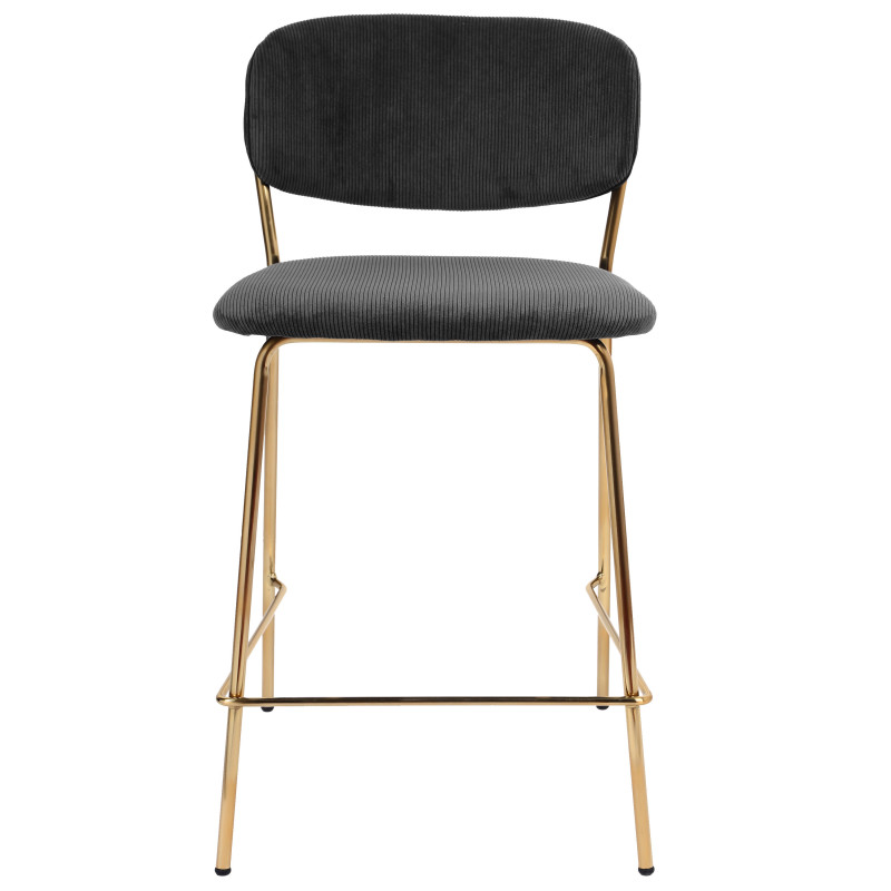 Seine 16-mm-Rohrstruktur aus gebürstetem Goldmetall sorgt für eine Sitzhöhe von 65 cm, kompatibel mit Mittelinseln und Arbeitsplatte.