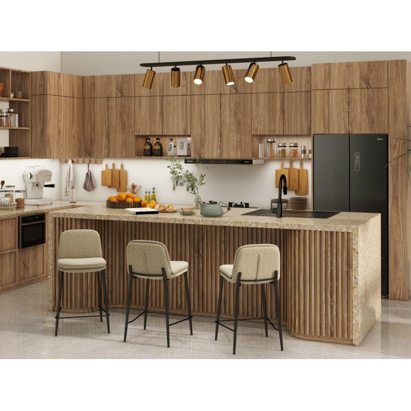 Der Barstuhl NOLAN ist absolut zeitgenössisch und kombiniert dank seiner subtilen Details ein nüchternes Design mit einer sehr schicken Linie. Besonders gefallen uns sein 16 mm starkes schwarzes Metallgestell mit konischen Füßen und die Nähte mit der doppelt gepolsterten Polsterung auf der Sitzfläche und Rückenlehne und mit einem hochwertigen Greige-Schlingenstoff mit Öko-Tex-Zertifizierung bezogen. Der Komfort ist offensichtlich vorhanden, dank der H.R-Schaumstoffpolsterung mit 26 kg/m3 und der 8 cm Dicke von Sitz und Rückenlehne. /> Seine Sitzhöhe beträgt 65 cm und ist für Kücheninseln geeignet. Erhältlich in mehreren Farben, können Sie in aller Ruhe ein schlichtes Set zusammenstellen oder die Farben nach Ihren Wünschen mischen.