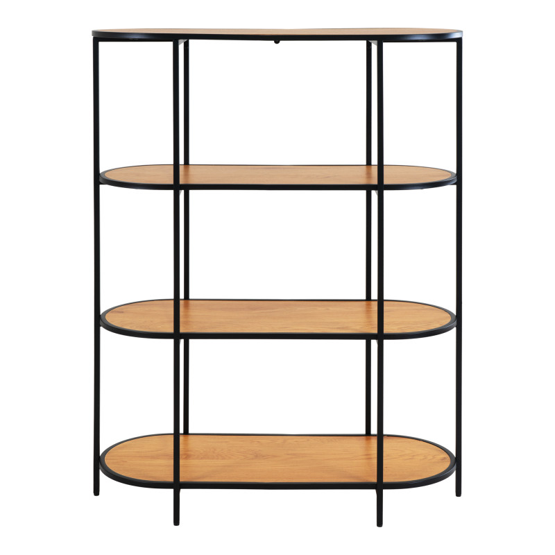 Elegantes Design. Dieses Regal aus Eiche und Metall bietet vier Ablageflächen in einem schwarzen Rahmen. Das luftige Design sorgt für ein aufgeräumtes Ambiente. Die perfekte Kombination aus Materialien und Linien für ein modernes Interieur.