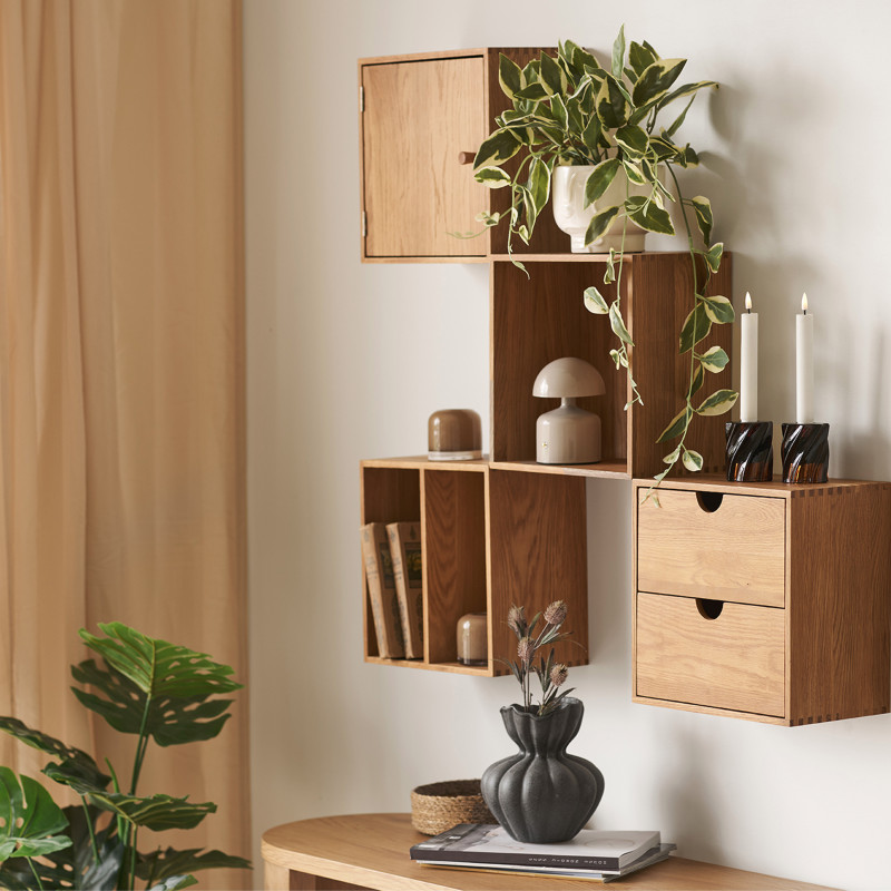 KU Kollektion: Wandwürfel aus massiver Eiche mit einer Tür Diskrete Aufbewahrungslösung aus Eiche. Dieser Wandwürfel aus massiver Eiche mit Tür bietet geschlossenen Stauraum und ist ideal, um Ihre persönlichen Gegenstände zu verbergen. Das schlichte Design bringt die natürliche Schönheit des Holzes perfekt zur Geltung. Die ideale Kombination aus Material und Form für ein aufgeräumtes Interieur. Kombinieren Sie ihn mit anderen Möbeln aus der Kollektion. Maße: B 30 x T 18 x H 30 cm