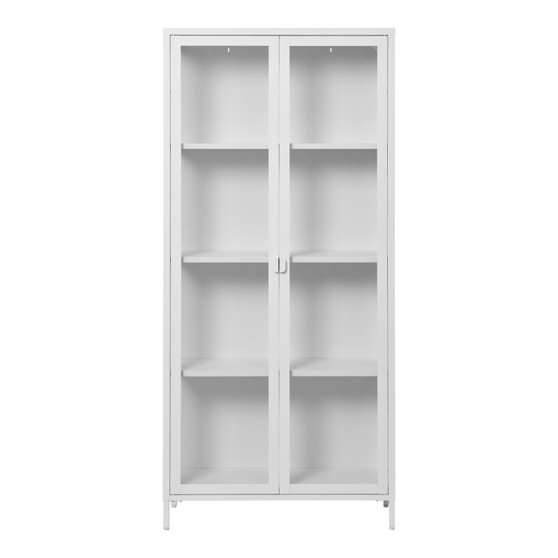 MAINE Kollektion: Weiße Vitrine mit 2 Türen Groß und hell. Diese hohe Vitrine aus weißem Stahl und Glas ist ideal zur Präsentation Ihrer Waren. Ihre großzügigen Abmessungen und die helle Farbe bringen Licht in jeden Raum. Die perfekte Kombination aus Material und Design für ein stilvolles Interieur.