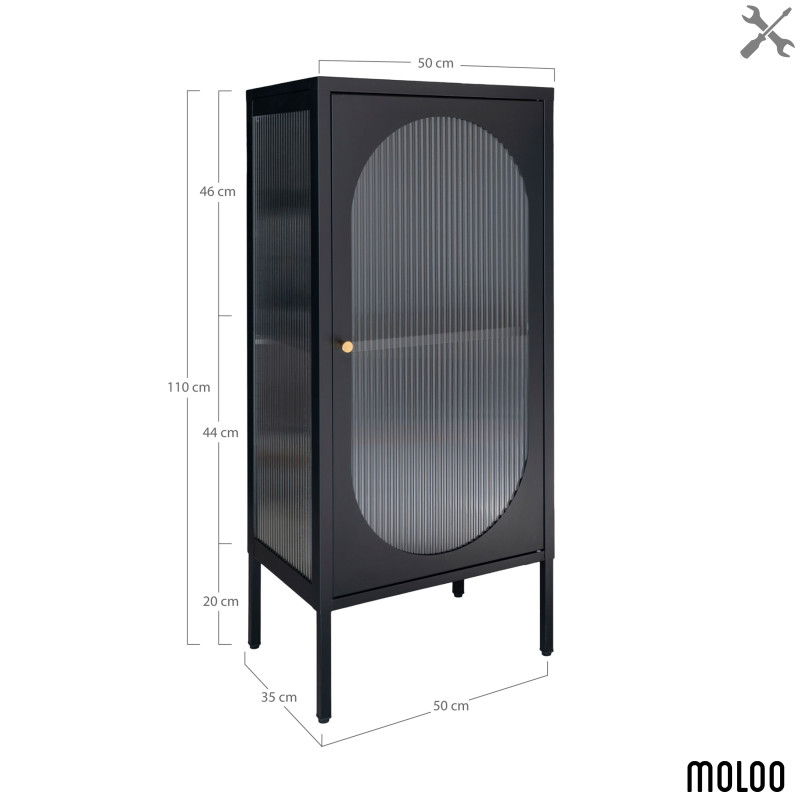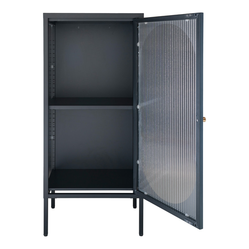 RETRO-Kollektion: Vitrine mit einer Tür und Wellglas Industrieller Vintage-Stil. Diese schmale Vitrine aus schwarzem Stahl besticht durch ihre Wellglastür im angesagten Retro-Look. Ideal, um Ihre Lieblingsstücke stilvoll in Szene zu setzen. Die perfekte Kombination aus Material und Form für einen unverwechselbaren Stil.