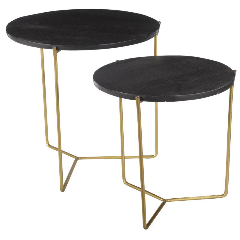 Set aus zwei runden Couchtischen „JULIA“, gefertigt aus massivem schwarzem Mangoholz und vergoldetem Messing.