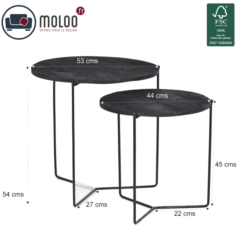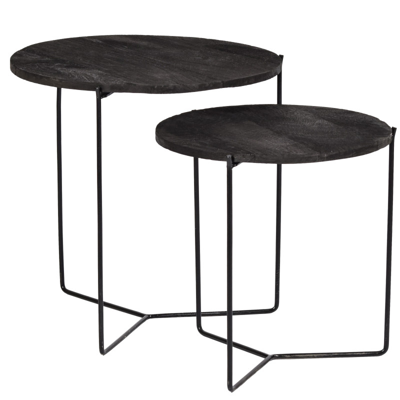 Set aus zwei runden Couchtischen „JULIA“, aus schwarzem Mangoholz und Stahl. Tischplattenmaße: 52/45 cm.