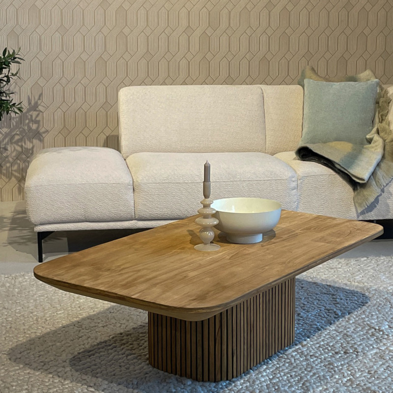 Entdecken Sie die raffinierte Eleganz der Kollektion PIANA, einer luxuriösen Serie aus zertifiziertem, nachhaltigem Teakholz mit einem eleganten Sockel aus schwarzem Stahl. Das Besondere an dieser Kollektion ist ihre ovale Form und das Spiel der Linien, kombiniert mit der natürlichen Optik des Teakholzes und den grifflosen Türen, die sich perfekt in das Design einfügen. Diese elegante Verarbeitung sorgt für einen minimalistischen Look, bei dem die natürliche Schönheit des Teakholzes voll zur Geltung kommt.