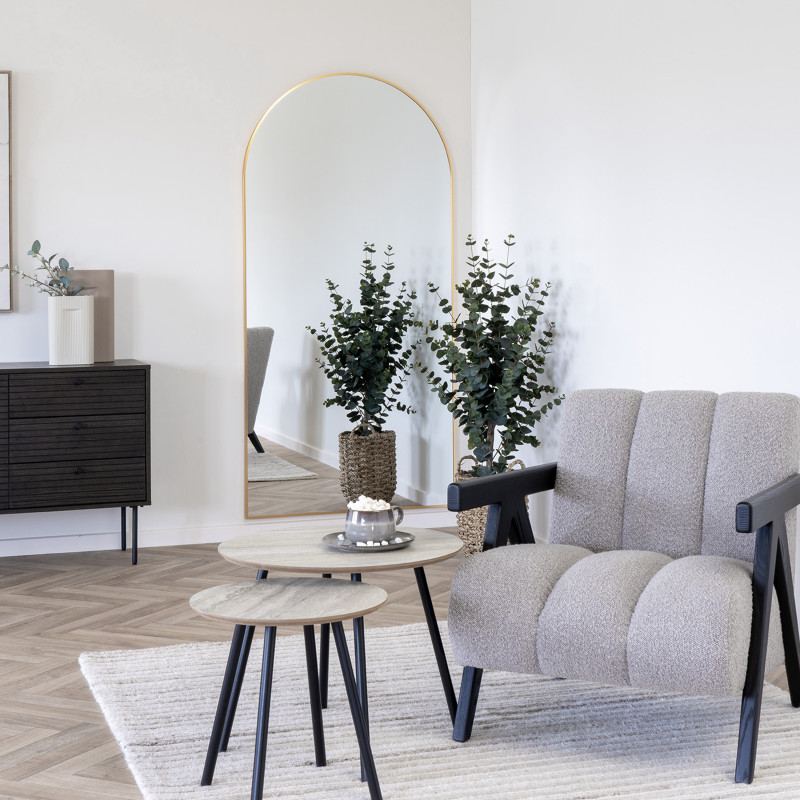 Kontrast und Eleganz. Dieser kompakte Couchtisch in Travertin-Optik verleiht jedem Raum eine edle, mineralische Note. Die strukturierte Tischplatte harmoniert perfekt mit dem schwarzen Metallgestell. Die ideale Kombination aus Material und Design für eine trendige Wohnzimmerecke.