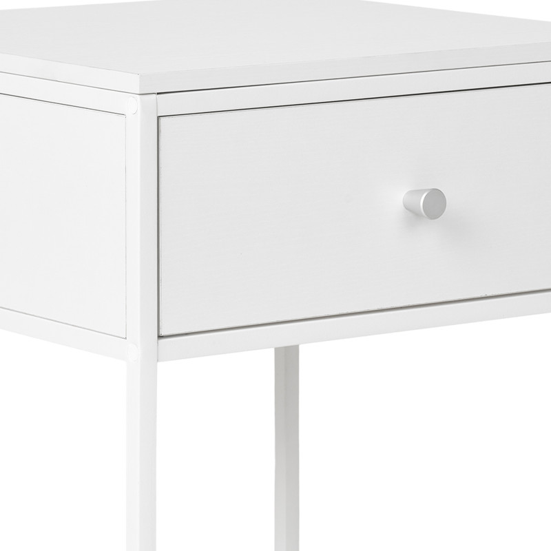 Strahlende Helligkeit. Dieser Beistelltisch aus weißem Metall eignet sich perfekt als Nachttisch. Sein industrieller Stil und die helle Farbe verleihen ihm eine luftige Leichtigkeit. Die ideale Kombination aus Material und Form für ein modernes Interieur.