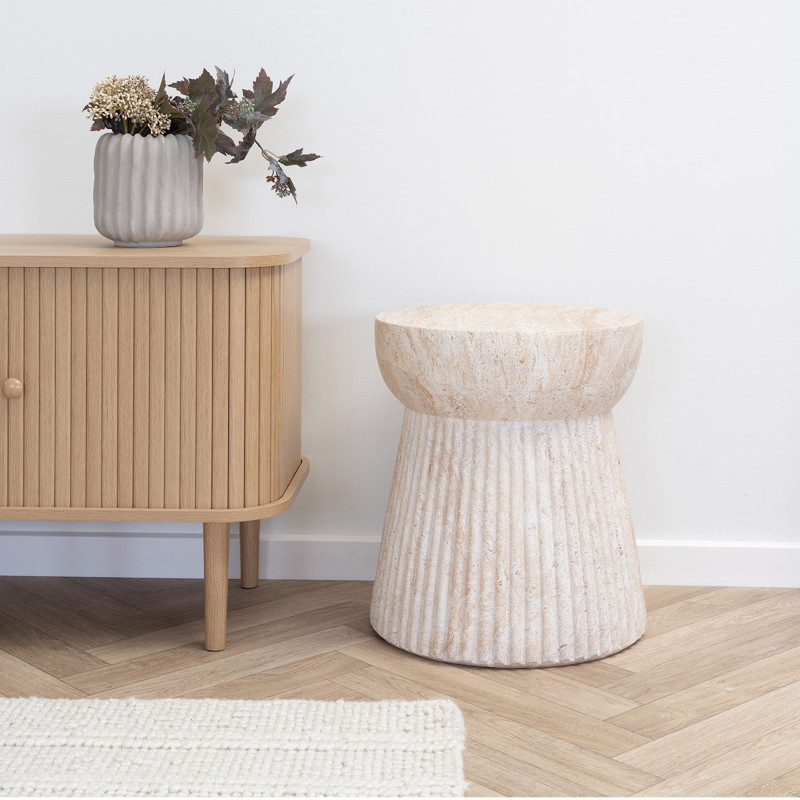 Natürliche Schönheit. Dieser kleine Beistelltisch aus faserverstärktem Ton in Steinoptik besticht durch seinen Charakter. Seine natürliche Textur und Farbe verleihen ihm einen authentischen Charme. Die perfekte Verbindung von Material und Form für einen Wabi-Sabi-Stil.
