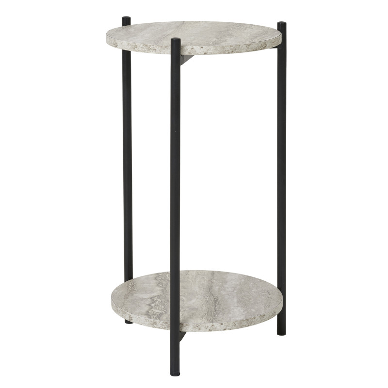 JIM Kollektion: Beistelltisch in Travertin-Optik Kompakte, mineralische Eleganz. Dieser Beistelltisch bietet Platz für eine Lampe oder ein Buch. Seine Tischplatte in Travertin-Optik harmoniert perfekt mit dem schwarzen Metallgestell. Die ideale Kombination aus Material und Design für eine stilvolle Ecke.