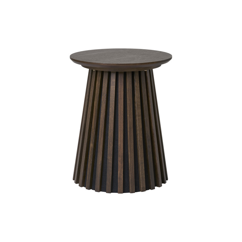 KAIRN Kollektion: Beistelltisch aus geräucherter Eiche Ein kompaktes Schmuckstück. Dieser Beistelltisch aus geräucherter Eiche besticht durch das charakteristische Lattenmuster der Kollektion. Er eignet sich perfekt als Beistelltisch und verleiht jedem Raum einen Hauch von dezentem Luxus. Die gelungene Kombination aus Material und Formgebung macht ihn zu einem stilvollen Blickfang.