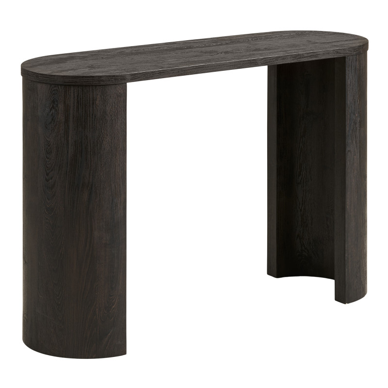 Klare Linien. Dieser 114 cm lange Konsolentisch in Dunkelbraun ist ideal für Eingangsbereich oder Flur. Sein minimalistisches, geschwungenes Design und die dunkle Farbe verleihen ihm einen modernen Touch. Die perfekte Kombination aus Material und Form für ein dezentes Möbelstück.
