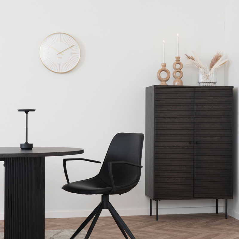 LOGIA Kollektion: Hohes Sideboard aus geräucherter Eiche Vertikale Eleganz. Dieses hohe Sideboard aus geräucherter Eiche, gefertigt aus Eiche und Metall, ist ein echter Blickfang. Das dunkle Holz und die klaren Linien verleihen ihm eine moderne Ausstrahlung. Die perfekte Kombination aus Material und Design für ein ausdrucksstarkes Wohnzimmer.