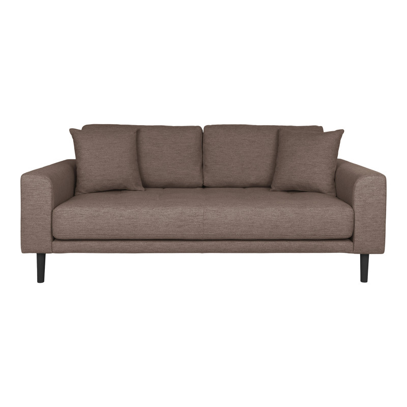 Wärme und dezente Eleganz. Dieses 2,5-Sitzer-Sofa in braunem Stoff ist ideal für ein gemütliches Wohnzimmer. Sein Holzrahmen garantiert Langlebigkeit. Die perfekte Kombination aus Material und Design für ein einladendes Ambiente. Dekorative Kissen inklusive.