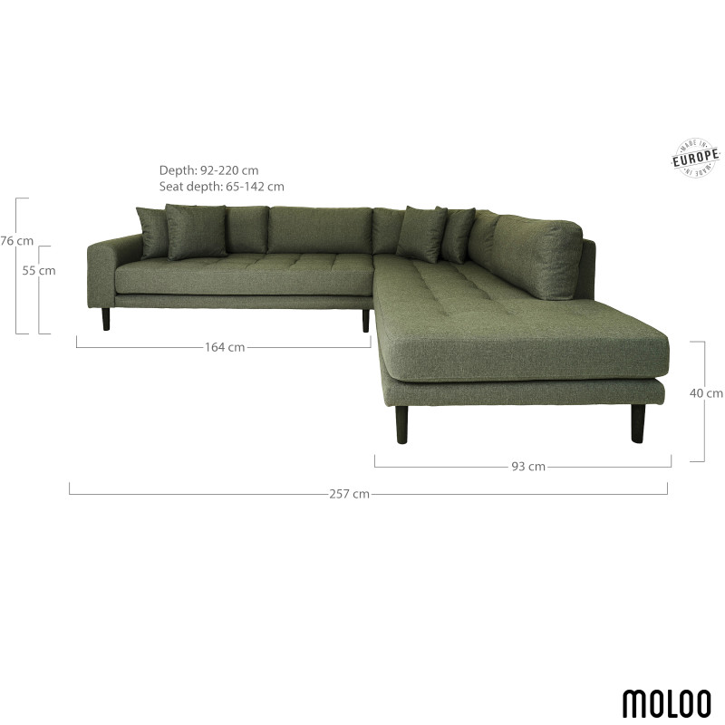 Harmonie und Entspannung. Dieses olivgrüne Ecksofa besticht durch sein warmes Design und außergewöhnlichen Komfort. Die Chaiselongue auf der rechten Seite lädt zum Ausstrecken der Beine ein. Die harmonische Kombination aus Stoff und Linien schafft eine ruhige Atmosphäre. Eingehüllter Komfort garantiert. Dekorative Kissen inklusive.