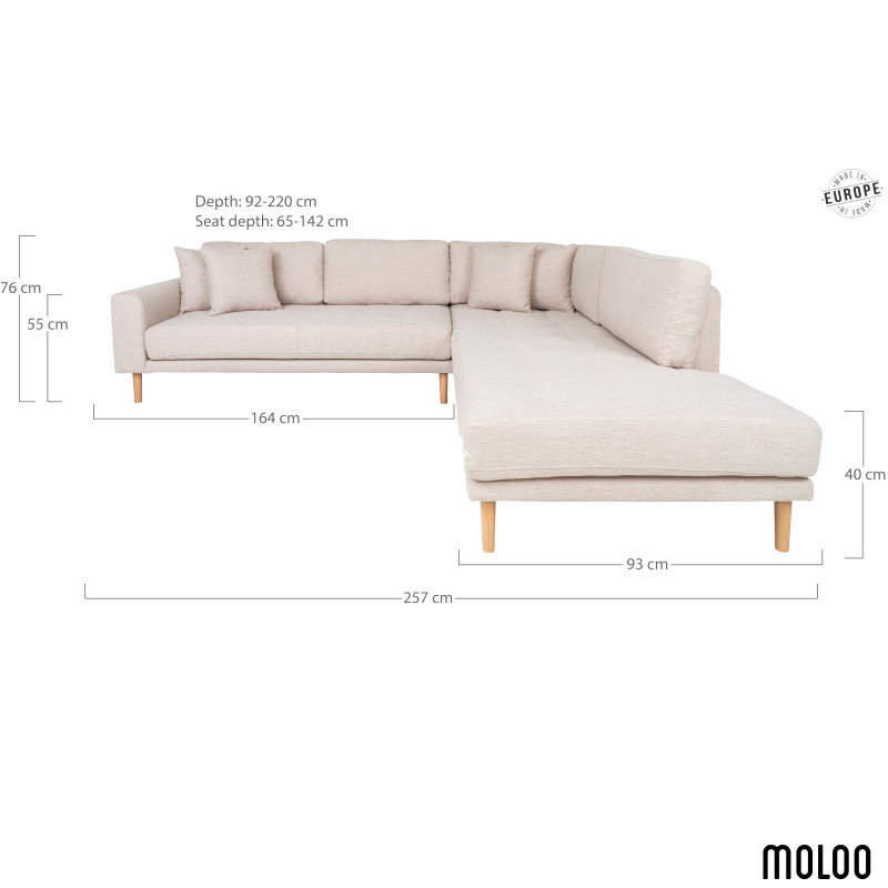 Maße: B 257 x T 92–220 x H 76 cm