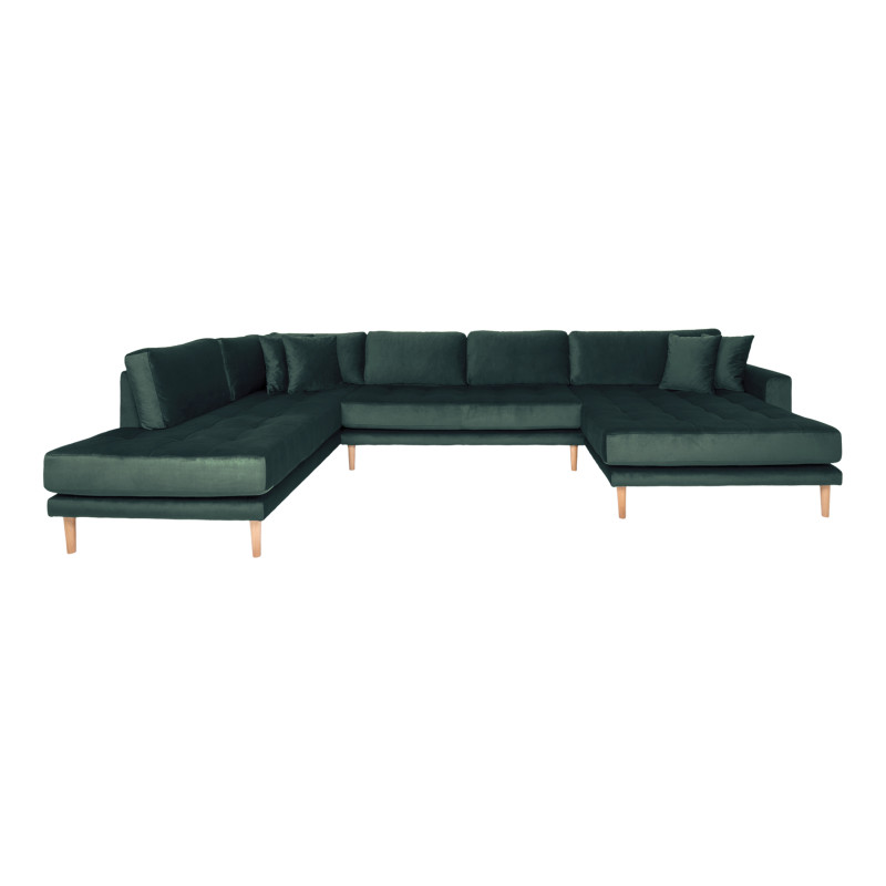 Großzügig und einladend. Dieses Panorama-Ecksofa in tannengrünem Samt kombiniert eine Chaiselongue links mit einem Tagesbett rechts. Es bietet der ganzen Familie bequem Platz. Die warme Farbe sorgt für ein behagliches Ambiente. Die perfekte Kombination aus Material und Design für ein besonders großes Wohnzimmer. Dekokissen inklusive.