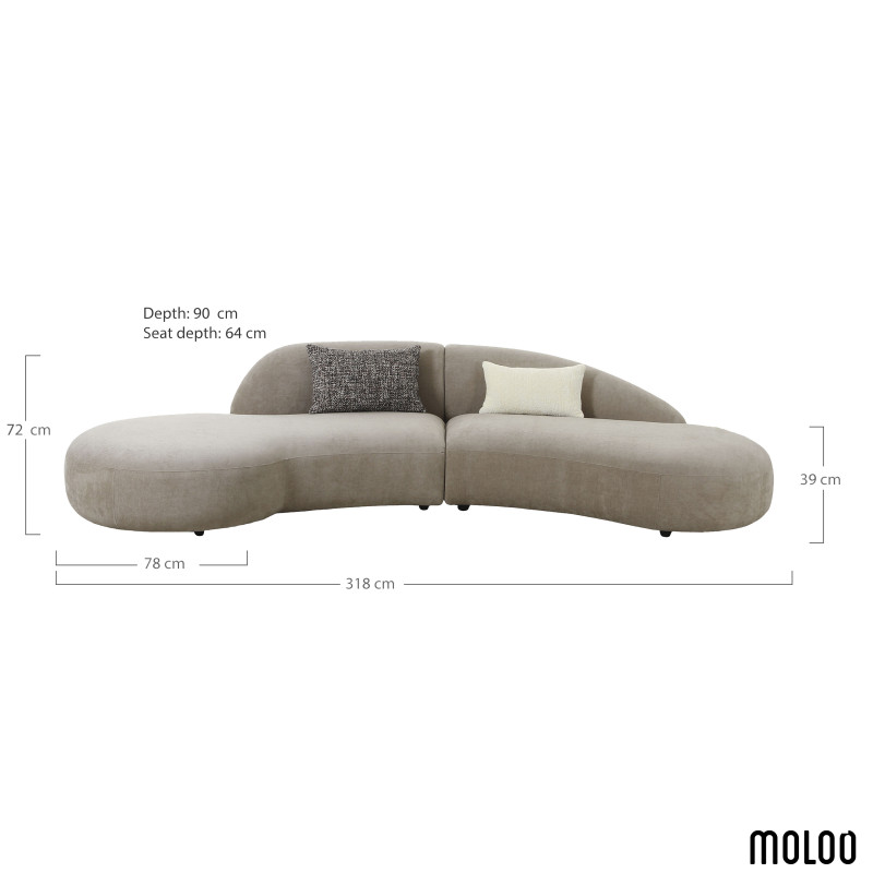 MIAMI Kollektion: Asymmetrisches Ecksofa Modernes Design, XXL-Größe! Dieses taupefarbene Ecksofa besticht durch seine asymmetrische Form und schafft einen einzigartigen Entspannungsbereich. Seine niedrige, einladende Form lädt zum Verweilen ein. Die perfekte Kombination aus Material und Linien für ein modernes Wohnzimmer. Garantiert behaglicher Komfort. Maße: B 318 x T 90 x H 72 cm