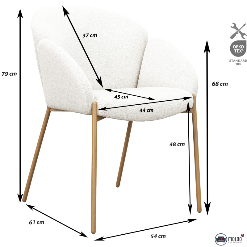 Bewundern Sie die feine Metallstruktur in Eiche-Optik (19 mm), die die Sitzfläche unterstreicht und sich zwischen Armlehnen und Rückenlehne einfügt, mit 4 asymmetrischen Beinen, die nach hinten geneigt sind, um die sehr markante Linie dieses Stuhls zu betonen.