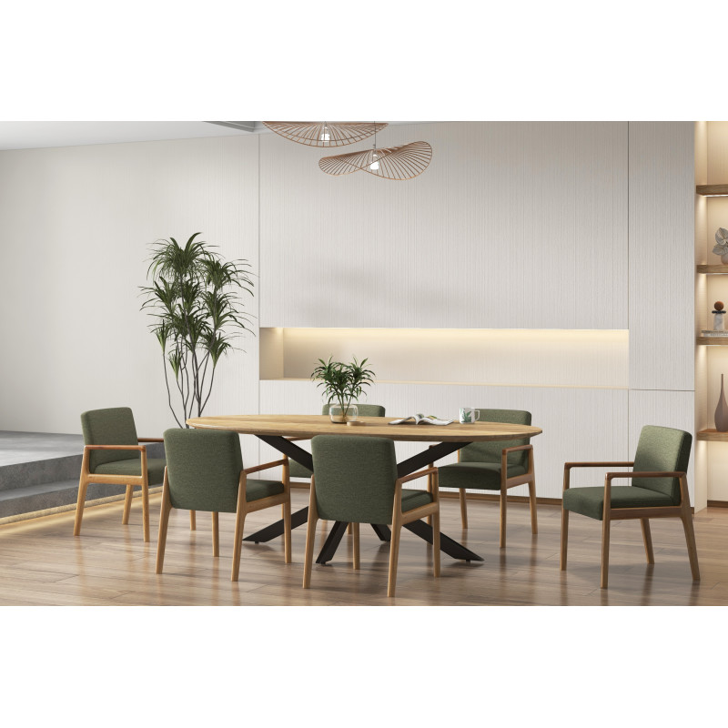 Der Tischstuhl ALBAN besticht durch sein entschieden zeitgemäßes Design, das dank der schönen Patina des Massivholzes und seines trendigen Bezugs sowohl schick als auch elegant wirkt.