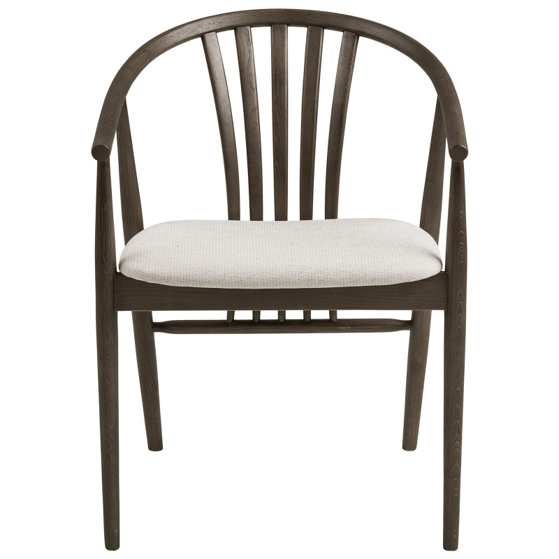 Komfort und Eleganz. Dieser Esszimmerstuhl mit beigefarbenem Stoffbezug steht auf einem stabilen Gestell aus geräucherter Eiche. Er bietet eine bequeme, einladende Sitzfläche mit Armlehnen. Die perfekte Kombination aus Material und Design für ein wohnliches Ambiente.