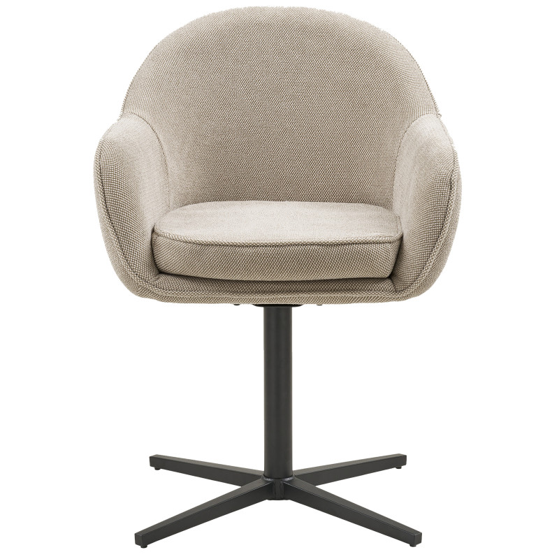 HIGS Kollektion: Drehbarer Esszimmerstuhl mit Stoffbezug Komfort und Bewegungsfreiheit. Dieser taupefarbene Stoffstuhl verfügt über einen um 180° drehbaren Sitz mit automatischer Rückstellfunktion für maximale Bewegungsfreiheit am Tisch. Sein Metallgestell sorgt für ein elegantes und modernes Design. Die perfekte Kombination aus Material und Design für komfortables Essen.