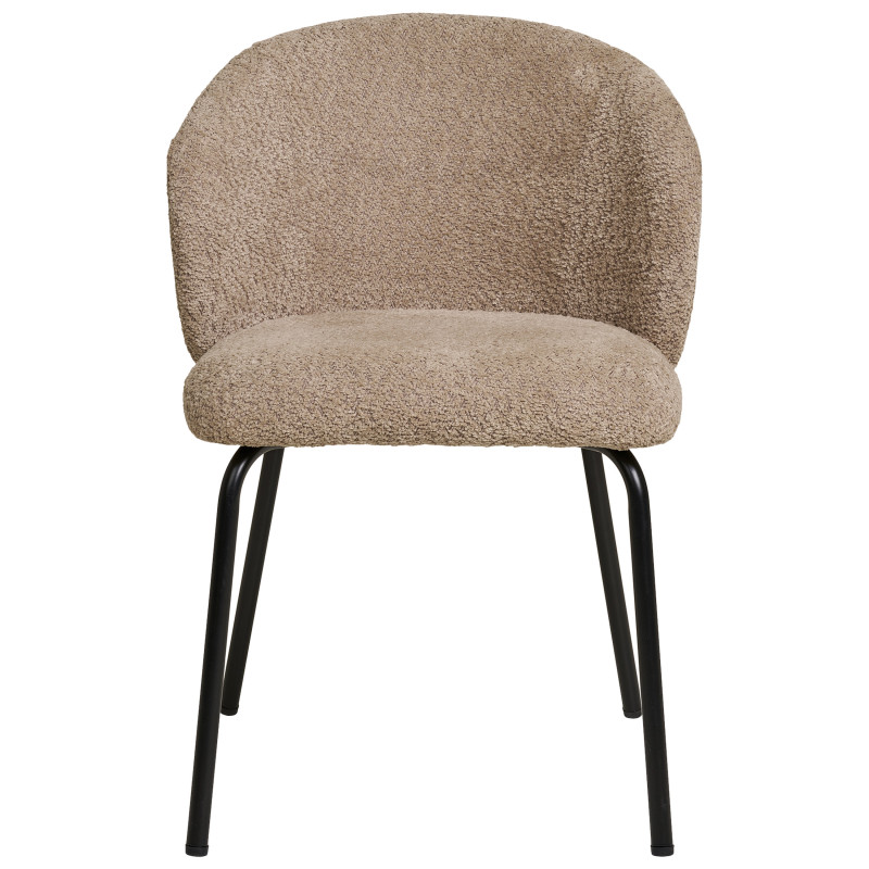 Komfort am Tisch. Dieser Stuhl aus beigefarbenem Bouclé-Stoff bietet bequemen und stilvollen Sitzkomfort. Die schlanken, schwarzen Metallbeine bilden einen dezenten Kontrast. Die perfekte Kombination aus Material und Design für ein gemütliches Essen.