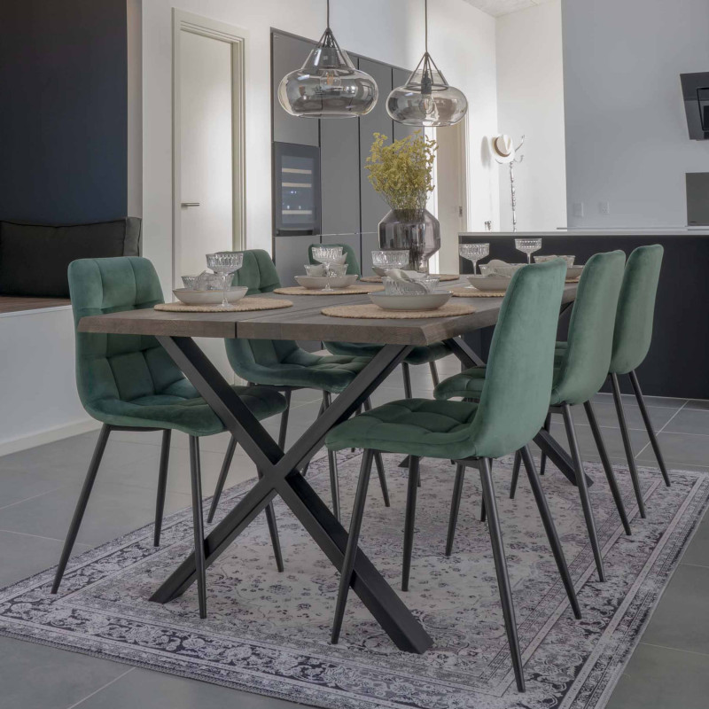 SVIN Kollektion: Grüner Samtstuhl Ein Hauch von eleganter Natur. Dieser hellgrüne Samtstuhl bringt eine beruhigende und trendige Farbe an Ihren Tisch. Der weiche Bezug und die Metallbeine machen ihn zu einem echten Blickfang. Die perfekte Kombination aus Material und Design für ein stilvolles Esserlebnis.