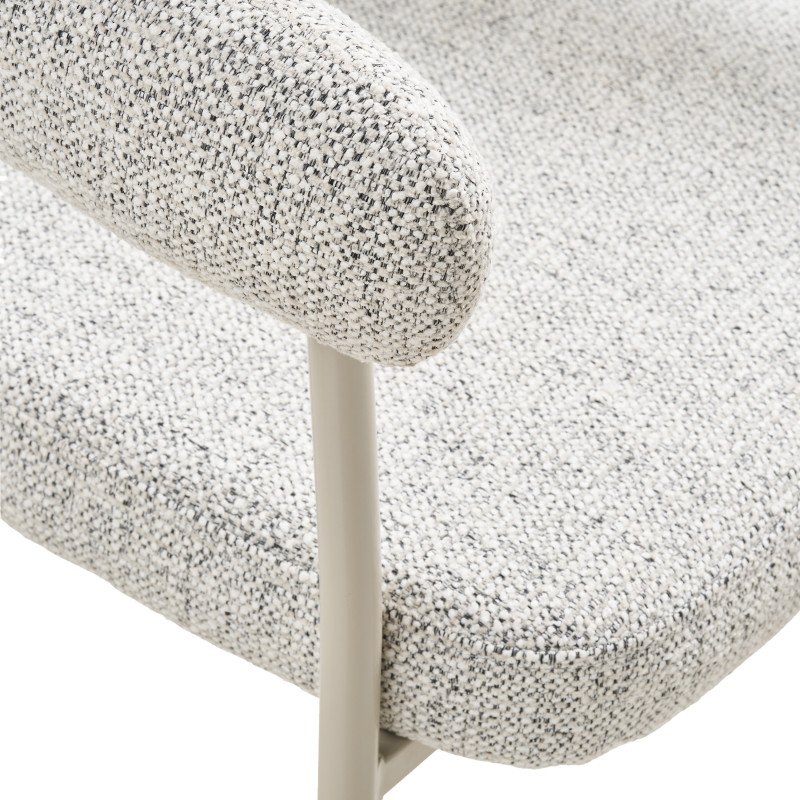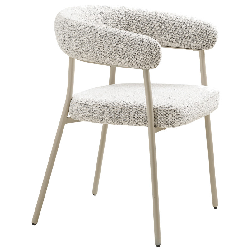 Weichheit und Leichtigkeit. Dieser Esszimmerstuhl mit sandfarbenem Stoffbezug ist ideal, um jedem Raum eine helle und freundliche Atmosphäre zu verleihen. Das beige Metallgestell sorgt für eine dezente Harmonie. Die perfekte Kombination aus Material und Linienführung für ein modernes Interieur.
