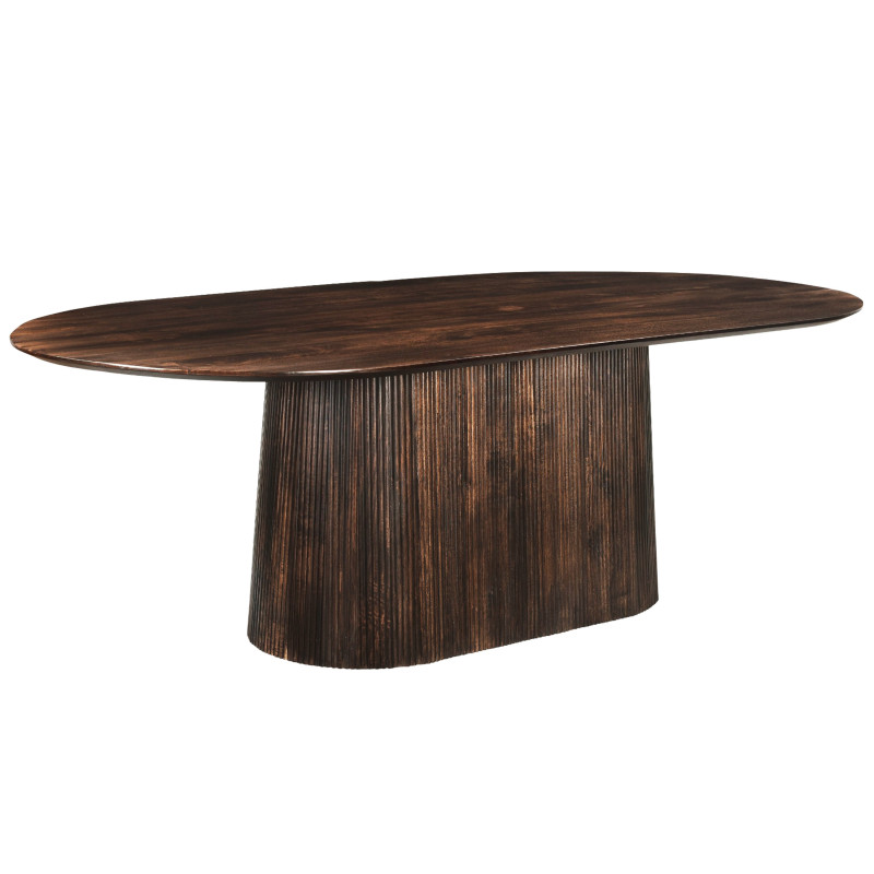 Die Kollektion SIENNE umfasst Esstische und kleine Beistellmöbel. Sie bietet ein sehr zeitgemäßes Design, indem sie ovale Tischplatten mit einer Stärke von 3 cm mit asymmetrischen Beinen kombiniert, die mit mehreren handgefertigten vertikalen Latten verziert sind. Das zertifizierte massive Mangoholz ist in zwei Ausführungen erhältlich: naturbelassen und braun gebeizt.