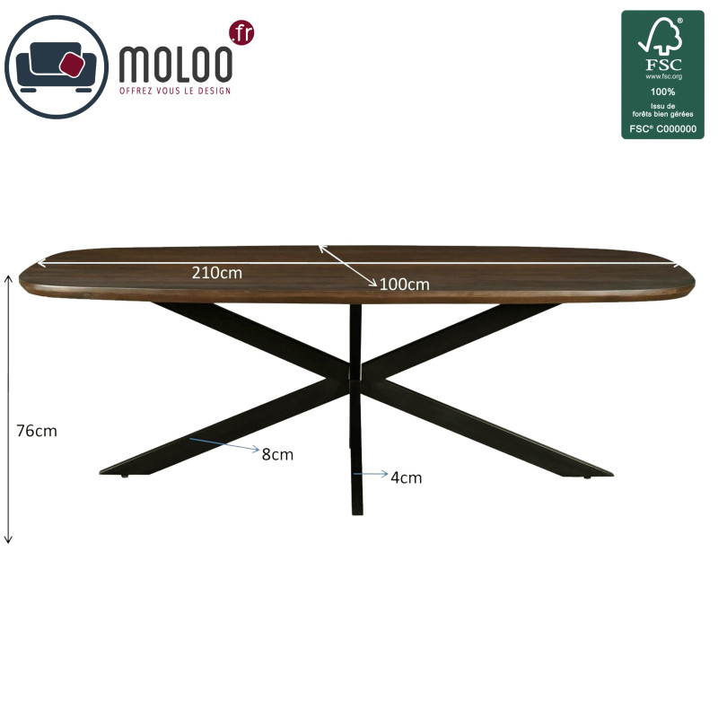 Der abgebildete Tisch ist 210 x 105 cm groß und hat eine ovale Tischplatte in Brauntönen.