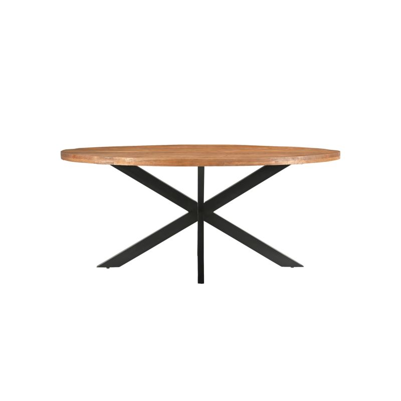 Piani in legno massello di mango certificato con bordi da 4 cm, gambe a ragno in acciaio nero, i tavoli della collezione BARI sono disponibili in diverse dimensioni e forme per adattarsi a tutti gli interni contemporanei.