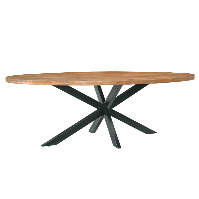 Piani in legno massello di mango certificato con bordi da 4 cm, gambe a ragno in acciaio nero, i tavoli della collezione BARI sono disponibili in diverse dimensioni e forme per adattarsi a tutti gli interni contemporanei.