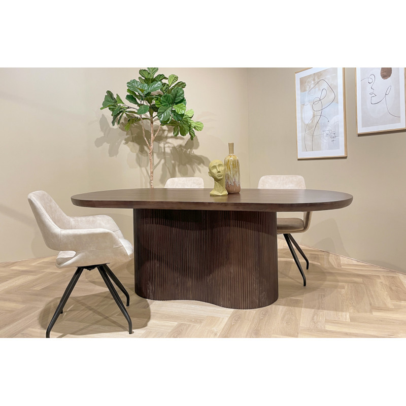 Die Tischkollektion SEVILLE umfasst Esstische in verschiedenen Größen bis zu 300 cm! Erhältlich in zwei Ausführungen – Natur oder Walnuss – kombinieren sie eine wunderschöne ovale Tischplatte mit 6 cm Kantenhöhe und einen geschwungenen Sockel mit mehreren handmontierten Lamellen.