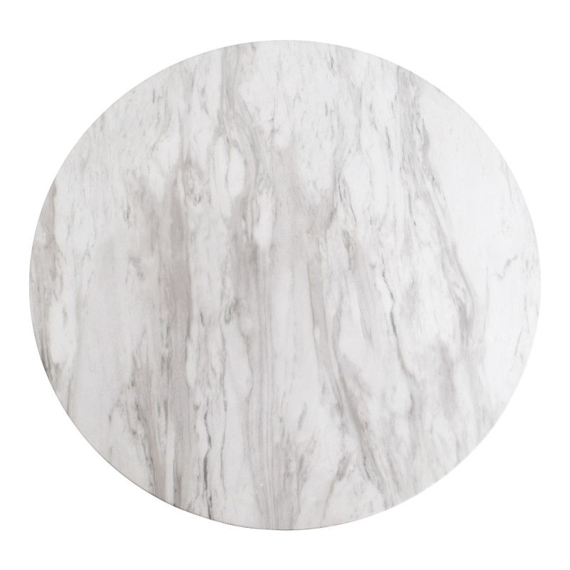 Rund und elegant. Dieser runde Tisch bietet Platz für vier Personen. Die Tischplatte in Marmoroptik und das Gestell aus messingfarbenem Metall verleihen ihm einen luxuriösen und modernen Look. Die perfekte Kombination aus Material und Design für ein stilvolles Esserlebnis.
