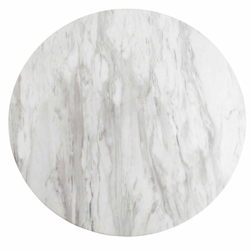 Ein wahres Schmuckstück. Dieser kompakte runde Tisch ist ideal für kleine Räume. Das messingfarbene Metallgestell bildet einen wunderschönen Kontrast zur Marmoroptik. Die perfekte Kombination aus Material und Design für einen gemütlichen Essbereich.