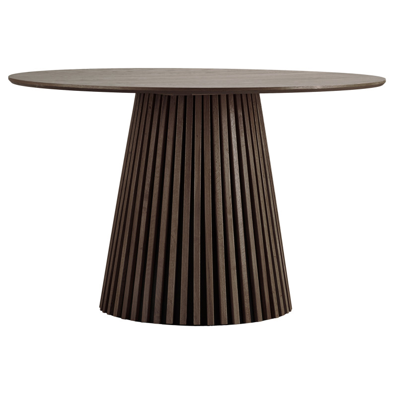 KAIRN Kollektion: Runder Tisch aus geräucherter Eiche Dieser runde Tisch aus geräucherter Eiche (120 cm Durchmesser) bietet Platz für vier Personen. Sein skulpturales Gestell aus geräucherter Eiche verleiht ihm eine besondere Designnote. Die perfekte Kombination aus Material und Form für ein stilvolles Ambiente.