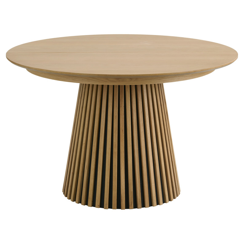 Natürlich und anpassungsfähig. Dieser runde Tisch aus Eiche Natur mit massivem Gestell lässt sich dank zweier Einlegeplatten erweitern (für 8 bis 10 Personen). Die Eiche verleiht ihm skandinavische Wärme. Die perfekte Kombination aus Material und Design für einen vielseitigen Tisch.