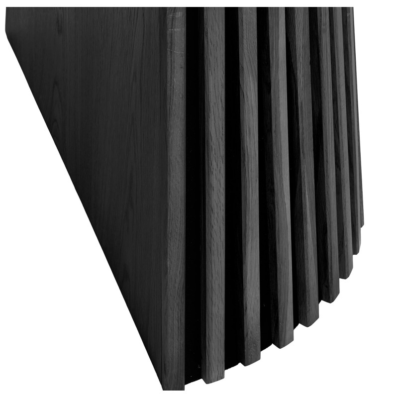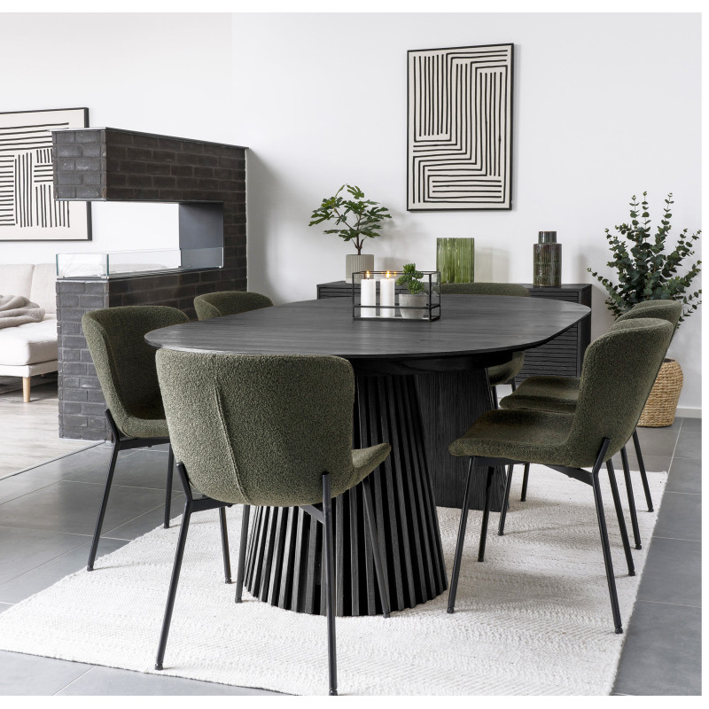 Charakter und Funktionalität. Dieser Tisch aus schwarzer Eiche lässt sich dank zweier mitgelieferter Verlängerungsplatten erweitern und besticht durch sein massives Gestell in der gleichen Farbe. Die schwarze Eiche verleiht ihm eine moderne und elegante Note. Die perfekte Kombination aus Material und Design für flexibles Essen.