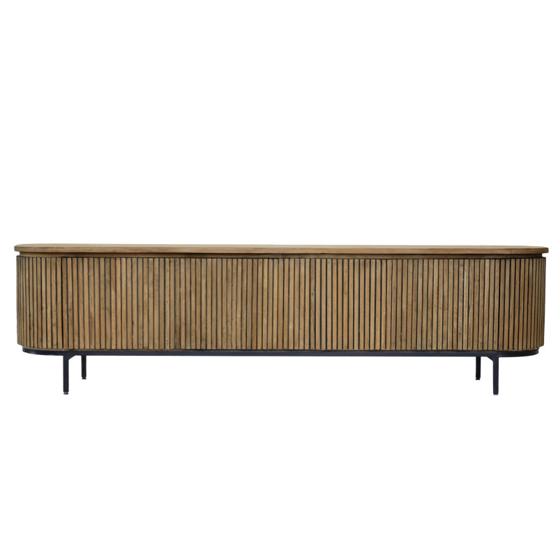 Entdecken Sie die raffinierte Eleganz der PIANA-Kollektion, einer luxuriösen Linie aus zertifiziertem, nachhaltigem Teakholz mit einem eleganten schwarzen Stahlsockel. Das charakteristische Merkmal der Kollektion ist ihre ovale Form und die verspielten Linien, kombiniert mit der natürlichen Optik von Teakholz und grifflosen Türen, die sich nahtlos in das Design einfügen. Diese elegante Oberfläche bietet einen minimalistischen Look, der die natürliche Schönheit von Teakholz unterstreicht.