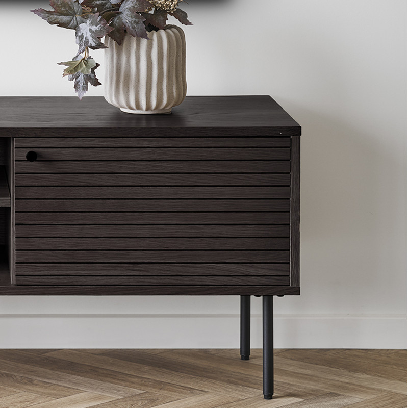LOGIA Kollektion: TV-Bank aus geräucherter Eiche Medien und Design. Diese 150 cm lange TV-Bank aus geräucherter Eiche besticht durch ihr niedriges, elegantes Profil. Die geräucherte Eiche, die Lamellenfront und die Metallbeine verleihen ihr einen schicken Industrie-Look. Die perfekte Kombination aus Material und Design für ein modernes Wohnzimmer.