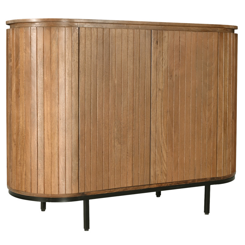 Los muebles de la colección MENTON están elaborados con refinada madera de mango y están disponibles en acabados nogal y natural. Su forma elíptica y sus laterales curvos, combinados con un juego de líneas verticales, son característicos de esta colección: ¡un guiño al estilo retro chic!