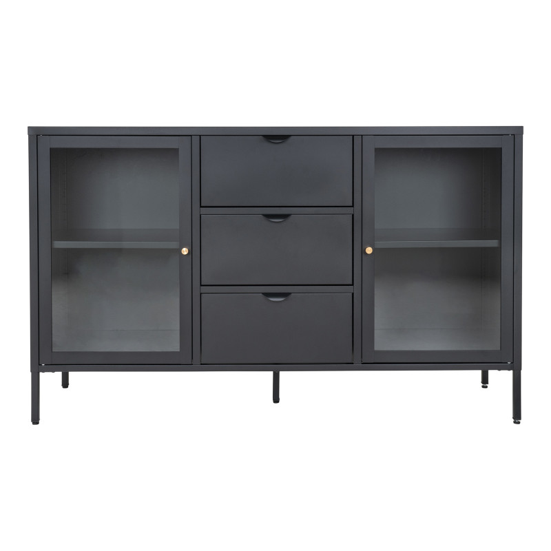 Almacenamiento completo. Este aparador de metal negro combina dos puertas de cristal y tres cajones para una organización óptima. Su diseño industrial es robusto y elegante a la vez. La combinación perfecta de material y líneas para un interior con estilo.