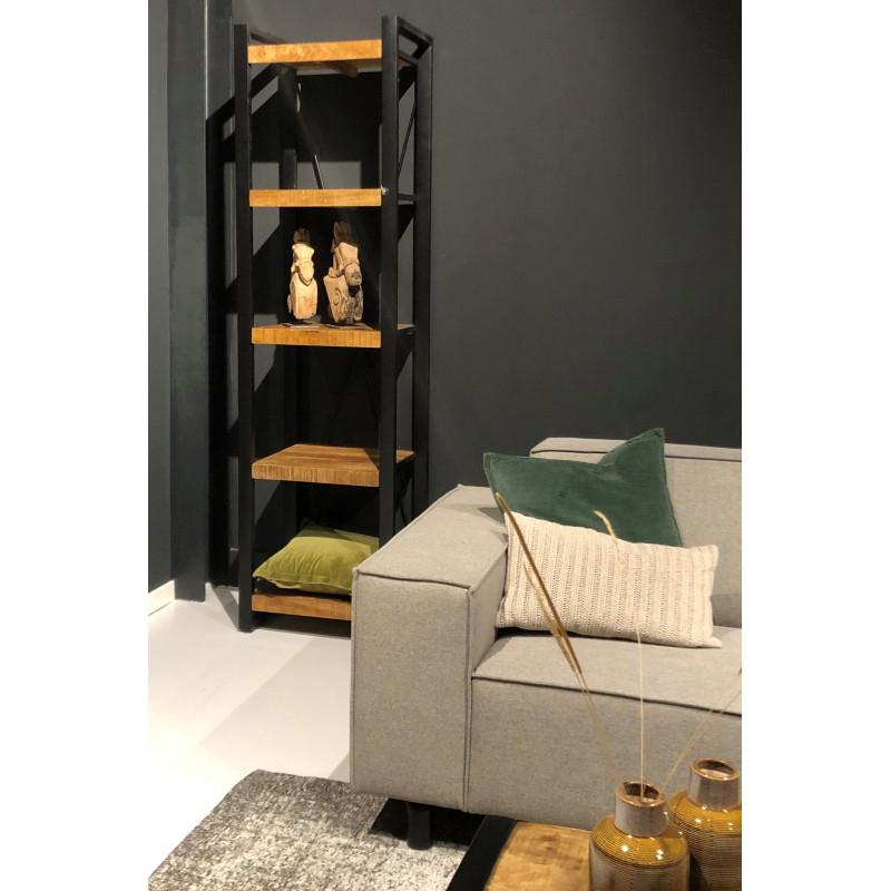 Robusta y sólida, la colección DACCA impone su estilo contundente gracias a sus gruesas secciones de madera y a las escaleras de acero negro de su estructura. Los detalles de la madera de mango se realzan con una hermosa pátina. La gama incluye un aparador, un aparador alto, librerías, mesas de comedor y pequeños muebles de salón.