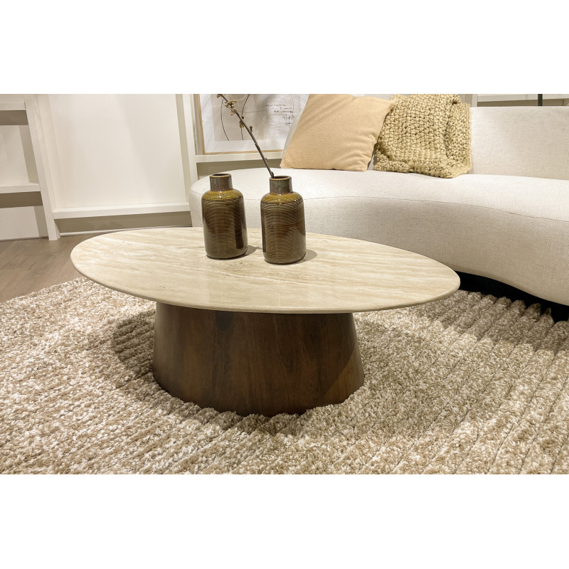 La colección STONE presenta el travertino combinándolo con madera maciza de mango marrón certificada para lograr un aspecto muy contemporáneo.