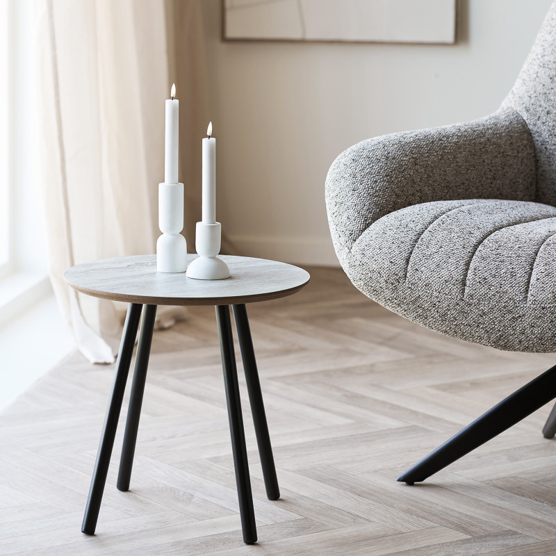 Contraste y elegancia. Esta mesa de centro compacta con efecto travertino aporta un toque sofisticado y mineral. Su superficie texturizada se complementa con una base de metal negro. La combinación perfecta de material y diseño para un rincón moderno en el salón.