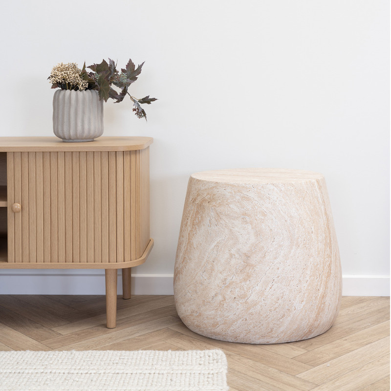 Elegancia escultórica. Esta mesa auxiliar mediana en tono piedra, fabricada en arcilla reforzada con fibra, es ideal como mesa de noche. Su diseño minimalista se ve realzado por la textura mineral. La combinación perfecta de material y líneas para un interior sofisticado.
