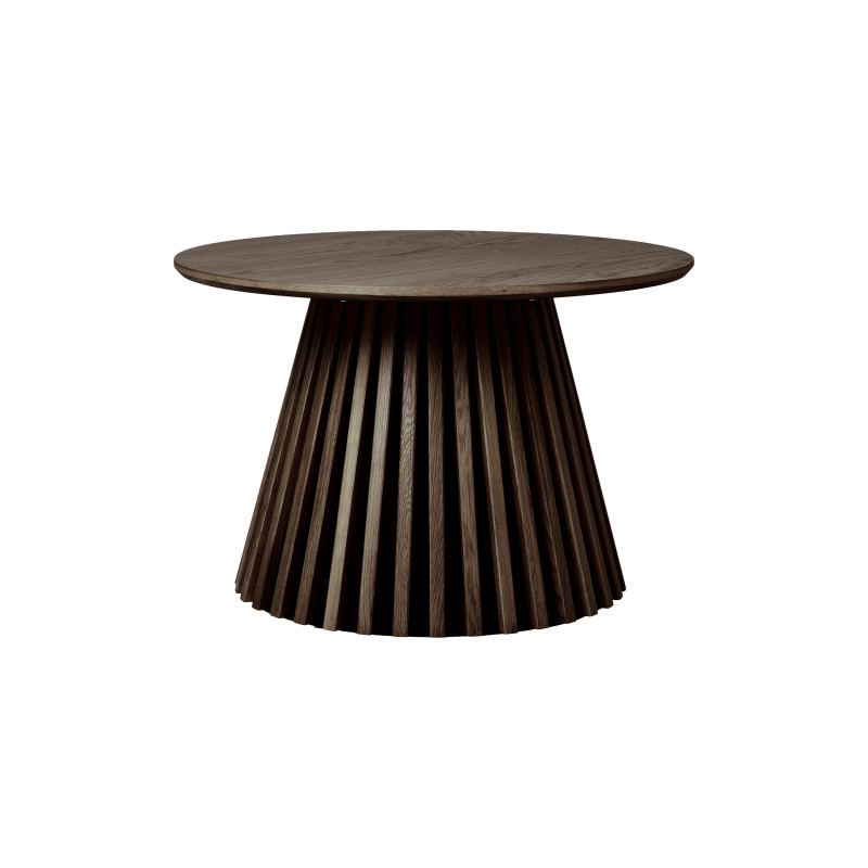 Textura y volumen. Esta mesa de centro redonda de roble ahumado se distingue por su base de listones. El roble ahumado crea un ambiente acogedor y sofisticado. La combinación perfecta de material y líneas para un salón elegante.