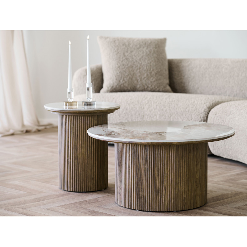 Curvas con carácter. Esta mesa de centro redonda de 80 cm es una pieza que destaca. La combinación de la superficie de cerámica y la base con efecto madera crea un estilo contemporáneo. La mezcla perfecta de materiales y líneas para un salón con personalidad.