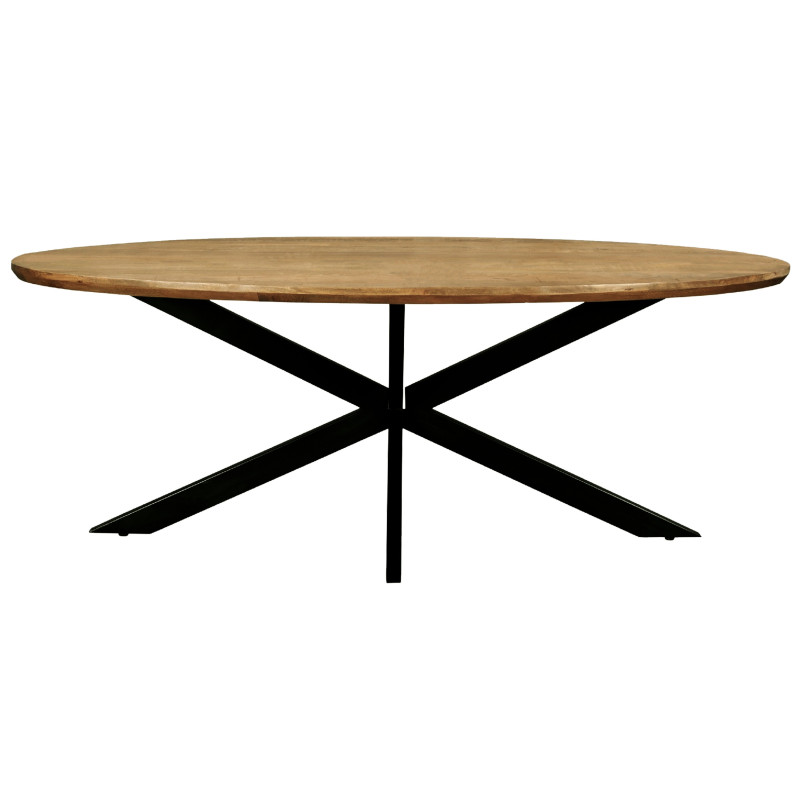 La colección de mesas de comedor MACY está disponible en formatos ovalados o redondos y en varios tamaños. Los tableros son de madera maciza de mango certificada en acabado natural o teñido, con cantos biselados de 4 cm de grosor. Las patas son de acero negro.