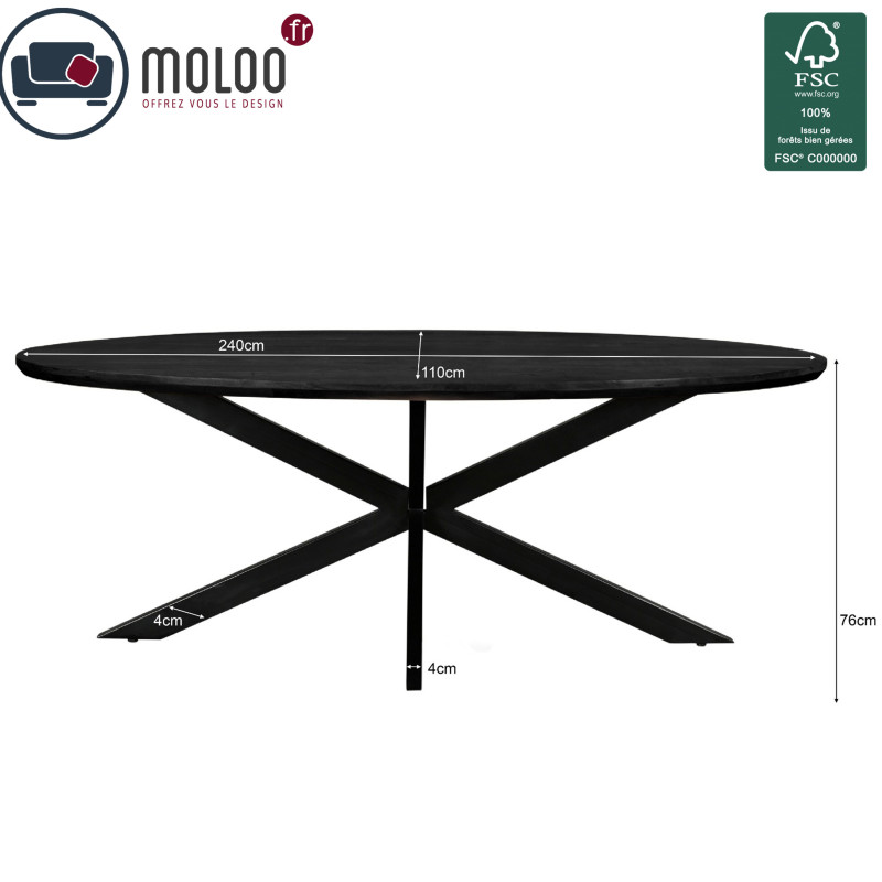 La colección de mesas de comedor MACY está disponible en formatos ovalados o redondos y en varios tamaños. Los tableros son de madera maciza de mango certificada en acabado natural o teñido, con cantos biselados de 4 cm de grosor. Las patas son de acero negro.